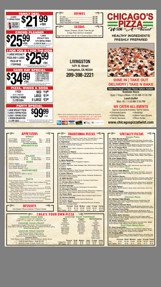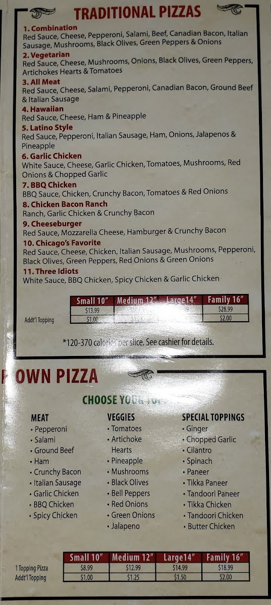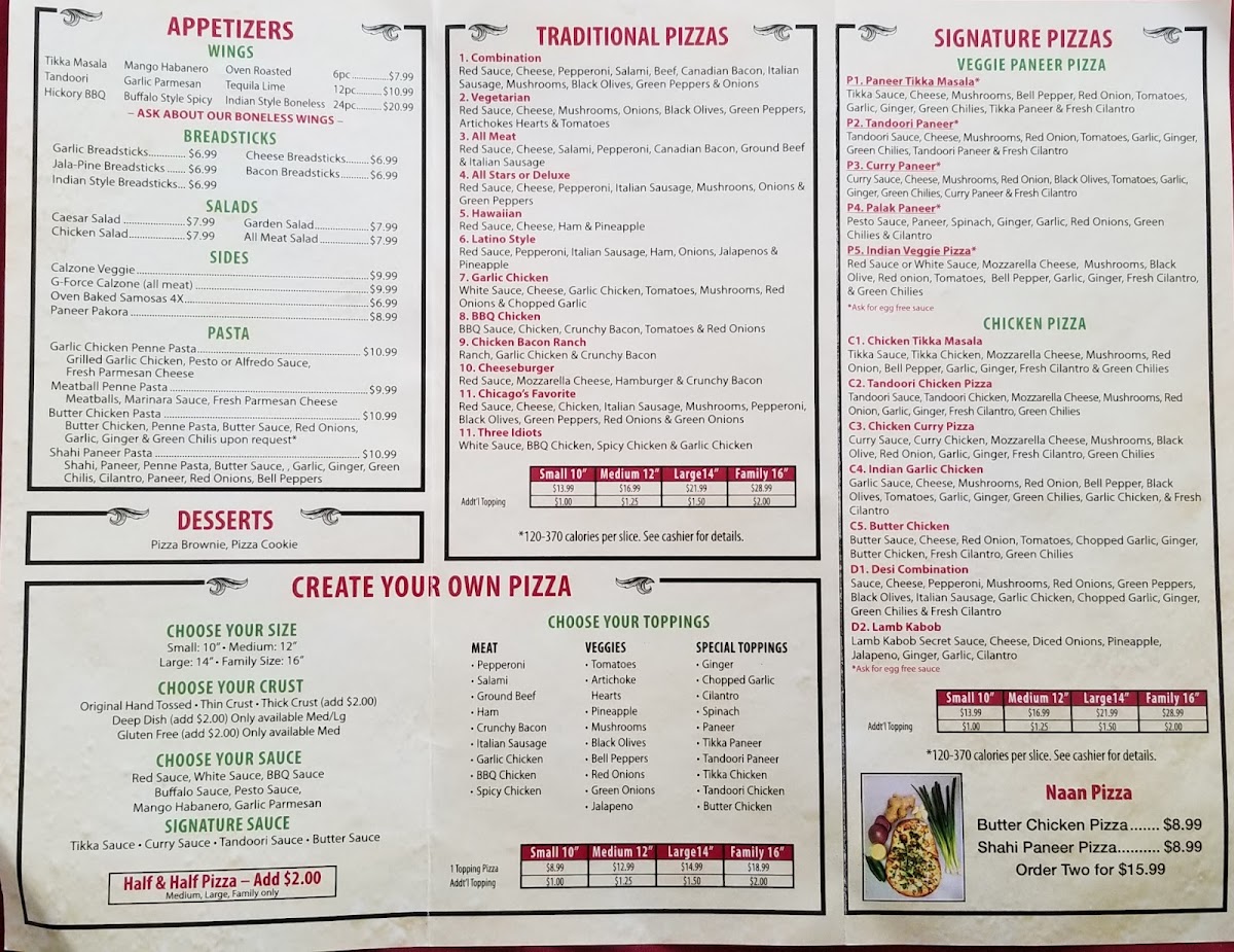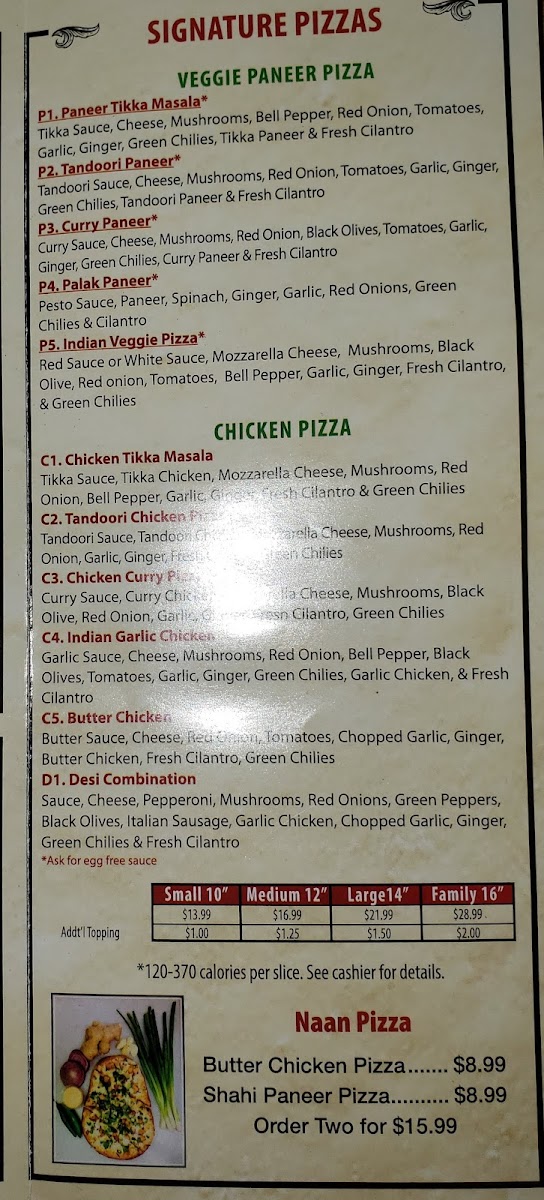 This pizza has our signature curry sauce, fresh diced mozzarella cheese, fresh mushrooms, crisp red onions, sliced black olives, juicy tomatoes, fresh cut garlic, ginger & green chilies, garnished with fresh cilantro.