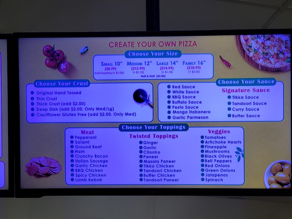 This pizza has our signature curry sauce, masala paneer, fresh diced mozzarella cheese, fresh mushrooms, crisp red onions, sliced black olives, juicy tomatoes, fresh cut garlic, ginger & green chilies, garnished with fresh cilantro.