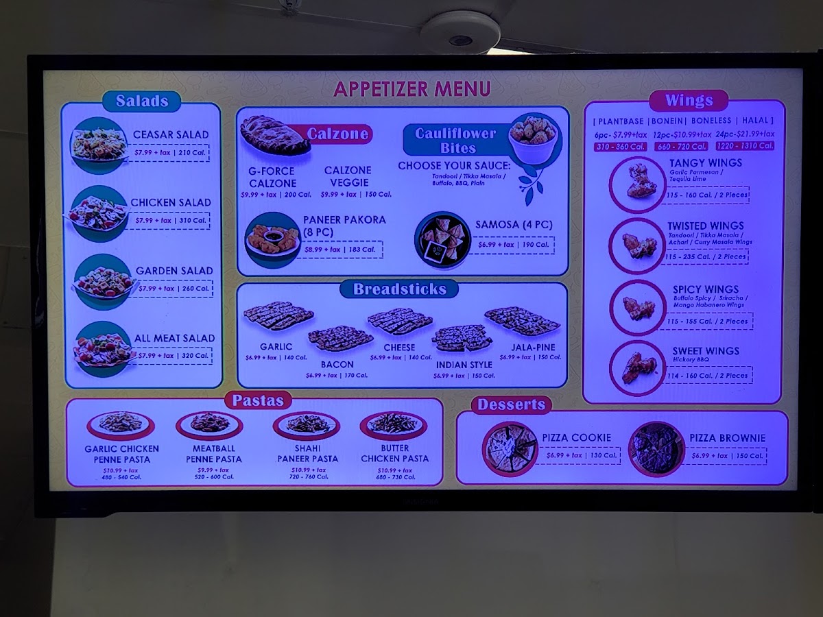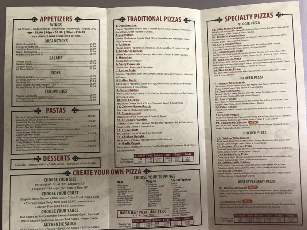 This pizza has our signature creamy garlic sauce, Achari paneer, fresh diced mozzarella cheese, crisp red onions, spicy jalapeno, garnished with fresh cilantro & Achari sauce.