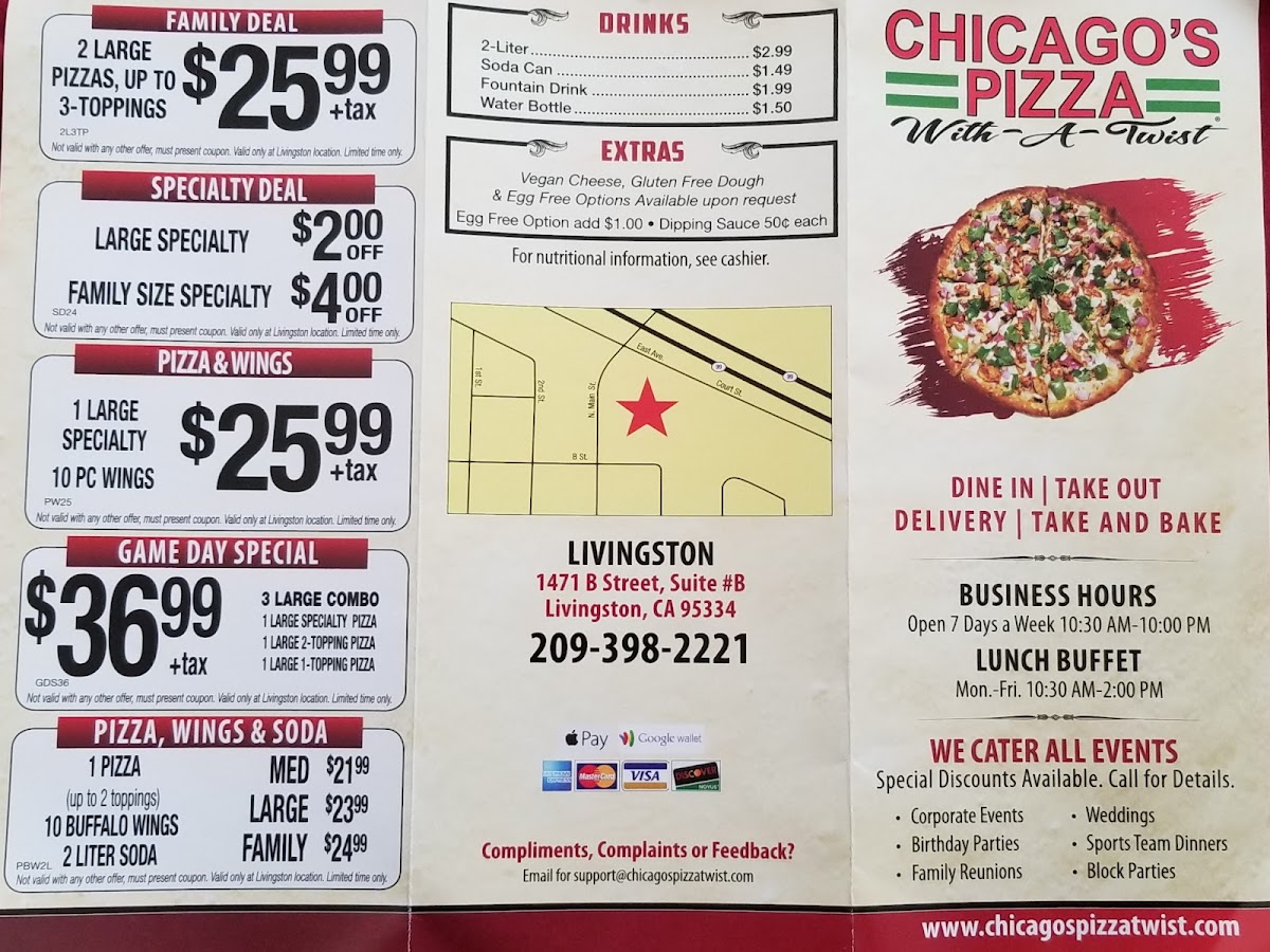 This Pizza has our signature red sauce, fresh diced mozzarella cheese, sliced pepperoni, sliced Canadian bacon, fresh mushrooms, crisp red onions, sliced black olives, crisp bell pepper, juicy Italian sausage & ground beef.